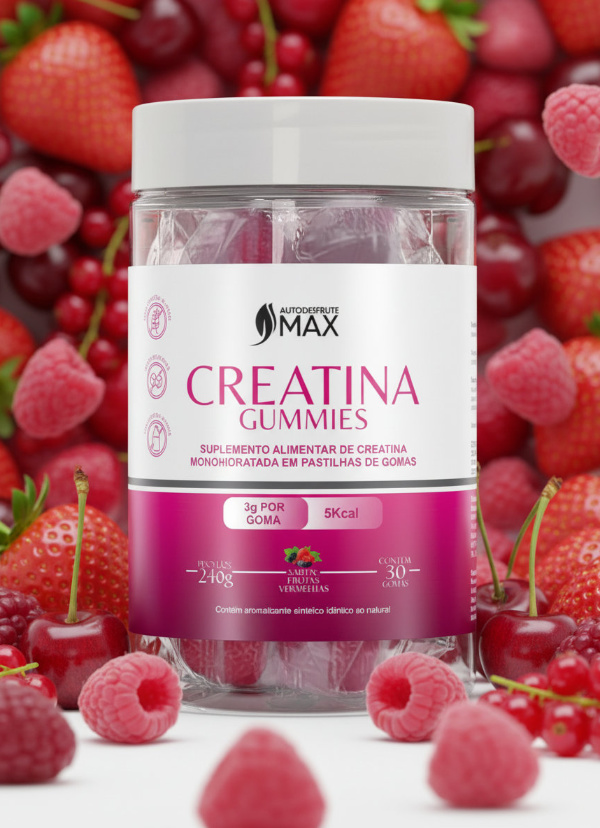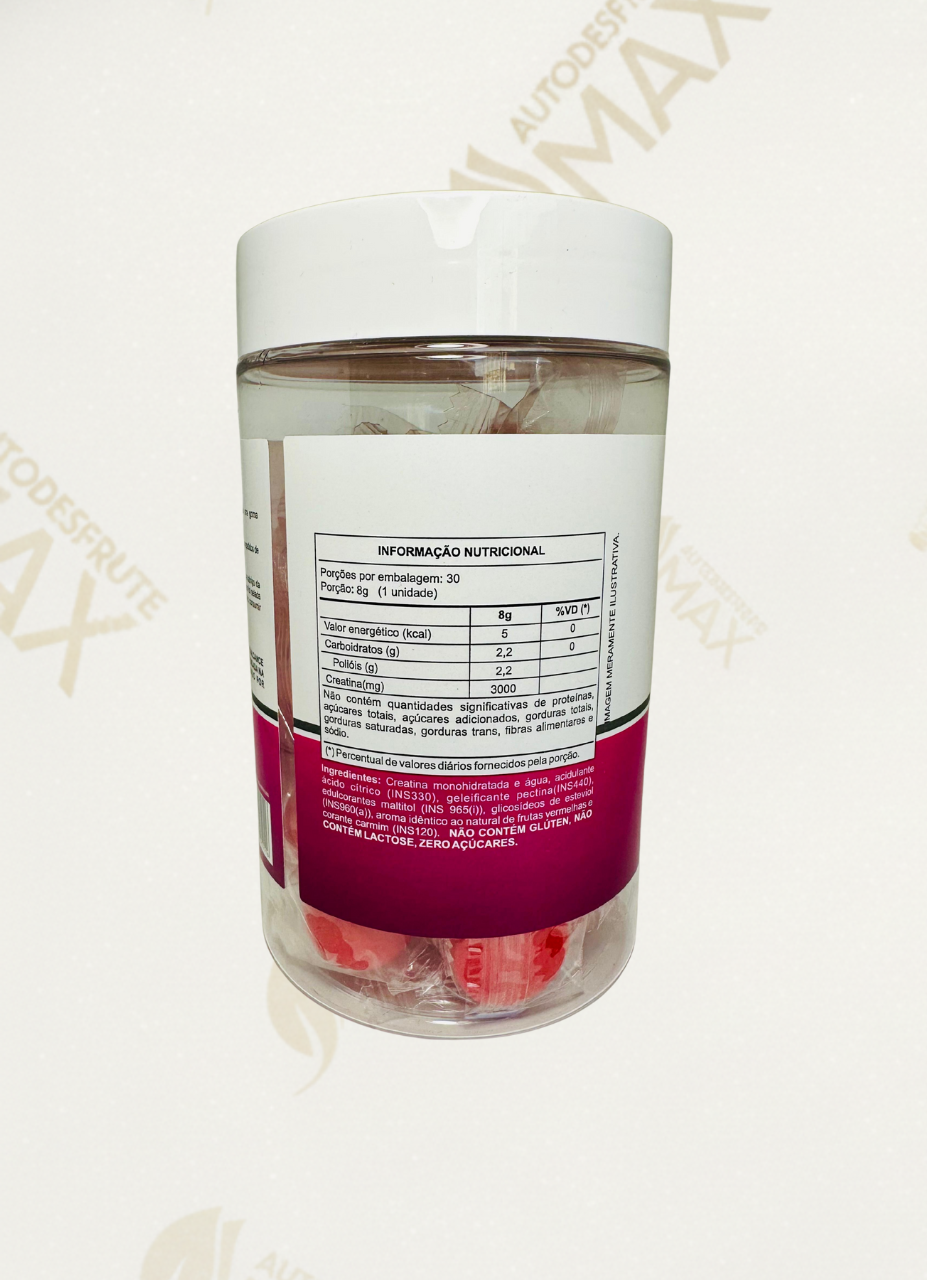 Creatina Gummies Frutas Vermelhas, com 3g de creatina monohidratada por goma.